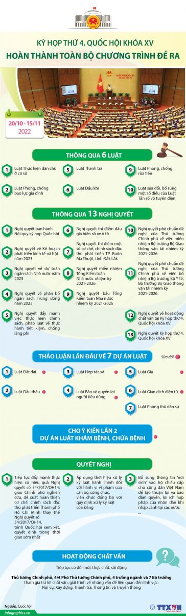 Có thể khẳng định, Kỳ họp thứ 4, Quốc hội khóa XV đã thành công tốt đẹp. Với sự quyết tâm, nỗ lực của các cơ quan, tổ chức hữu quan, chuẩn bị kỹ lưỡng, chất lượng những nội dung của Kỳ họp, mặc dù có những điều chỉnh nhất định về chương trình, bổ sung thêm nội dung nhưng vẫn bảo đảm sự thông suốt, linh hoạt, hiệu quả trong điều hành và thực hiện thành công chương trình Kỳ họp với sự đồng thuận, thống nhất cao và thời gian kỳ họp được rút ngắn hơn.