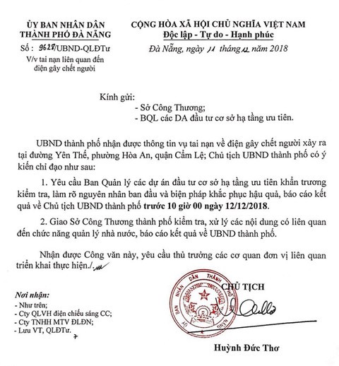Ngày 12/12, vị đại diện ban Quản lý các dự án đầu tư cơ sở hạ tầng ưu tiên TP Đà Nẵng cho biết, đơn vị này sẽ báo cáo lên Chủ tịch UBND TP Đà Nẵng về vụ tai nạn điện khiến 1 người chết, 1 người bị thương trên đường Yên Thế, quận Cẩm Lệ, TP Đà Nẵng.