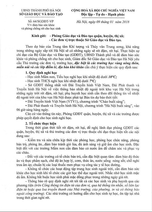 Công văn nêu rõ: Trong thời gian rét đậm, rét hại, phụ huynh học sinh cần theo dõi thông tin về nhiệt độ ngoài trời của khu vực Hà Nội tại bản tin dự báo thời tiết trong chương trình Chào buổi sáng trên kênh VTV1 của Đài Truyền hình Việt Nam, chương trình "Hà Nội buổi sáng" của Đài Phát thanh và Truyền hình Hà Nội. Nếu nhiệt độ dưới 10oC, phụ huynh khối mầm non, tiểu học có thể cho con nghỉ học.