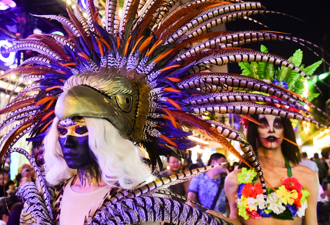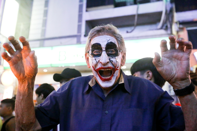 Tối 31/10, không khí Halloween rộn ràng trên phố đi bộ Bùi Viện (quận 1, TP HCM). Từ 19h, hàng nghìn người đổ về con phố gây nên cảnh ùn tắc kéo dài, nặng nhất là đoạn giao với đường Đề Thám. Các điểm giữ xe đều chật kín, giá vé gửi xe tăng 30.000 - 40.000 đồng một chiếc.