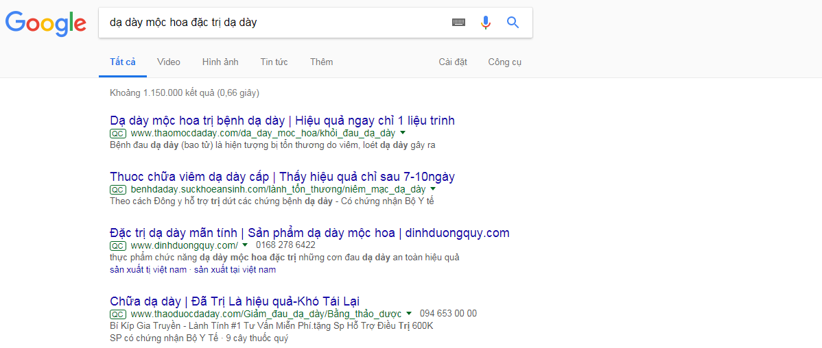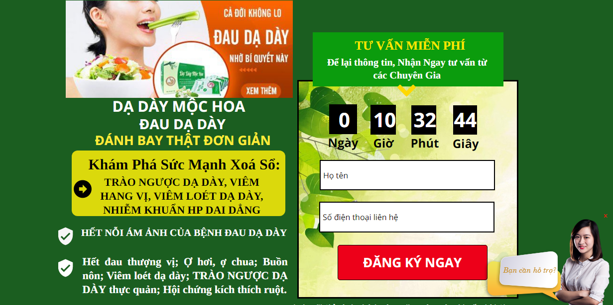 Với việc sử dụng những dòng quảng cáo như: “Dạ dày mộc hoa giúp loại bỏ nhanh chóng các triệu chứng do trào ngược dạ dày, viêm hang vị, nhiễm khuẩn HP gây nên. Liệu pháp này ngăn chặn tức thì vi khuẩn HP, các tế bào gây hại phát triển. Kiên trì sử dụng 1 đến 2 liệu trình, mọi triệu chứng như: "cảm giác ợ hơi, ợ chua buồn nôn kéo dài, nôn khan, nóng rát thượng vị tức ngực khó thở, thậm chí nghiêm trọng hơn là sút cân, thiếu máu hay đại tiện phân đen"... sẽ biến mất.”