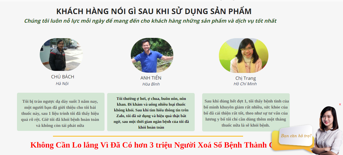 Để quảng cáo cho sản phẩm, công ty này còn đăng tải hàng loạt bài viết, chia sẻ nội dung chủ yếu là trước khi sử dụng sản phẩm thì khổ sở về bệnh tật như thế nào, khi sử dụng sản phẩm một thời gian thì bệnh tình thuyên giảm, các triệu chứng do bệnh gây nên dần biến mất và sản phẩm sẽ có tác dụng ngăn ngừa tái phát. Đó cũng chính là lý do để nhân vật viết thư cảm ơn, chia sẻ với người khác. Để thêm tính thuyết phục, những bài chia sẻ đều có tên, tuổi, địa chỉ, hình ảnh cụ thể của nhân vật trải nghiệm.