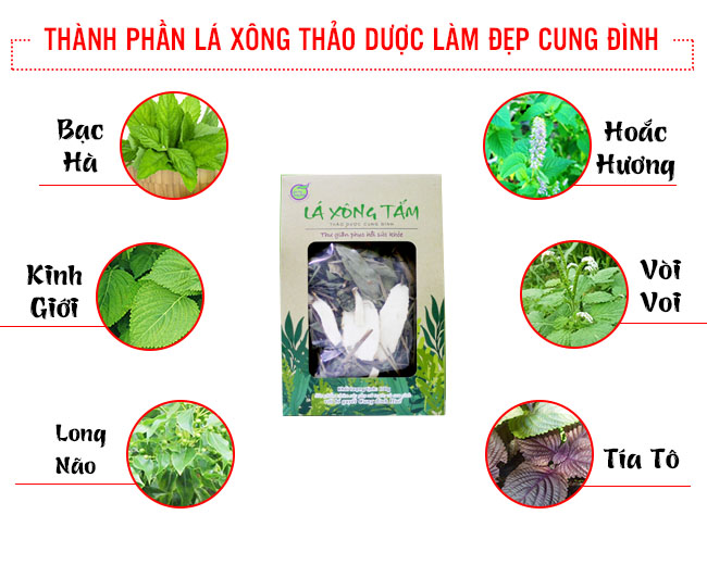 Lá xông thảo dược là sự kết hợp của 10 thành phần thảo dược. Ngoài thành phần chính như bạc hà, kinh giới, tía tô, hoắc hương, vòi voi, long não còn có thêm Bạch chỉ: Trị đau đầu, trị thương hàn cảm cúm ,trụ các bệnh ở mắt, trị mồ hôi trộm , trị thủng độc … Lá sả : giúp giải độc, trị đau bụng , giảm cơn đau nhức , làm đẹp da…Kim ngân hoa: kháng khuẩn, chống viêm, làm giảm chất xuất tiết, giải nhiệt và làm tăng tác dụng thực bào của bạch cầu…Lá ngũ trảo : trị cảm mão, sốt, nhức đầu , sỗ mũi , đau lưng, kích thích tiêu hóa, trị đau nhức khớp xương ...Tất cả các thành phần này làm nên tác dụng tuyệt vời cho sức khỏe của bạn.