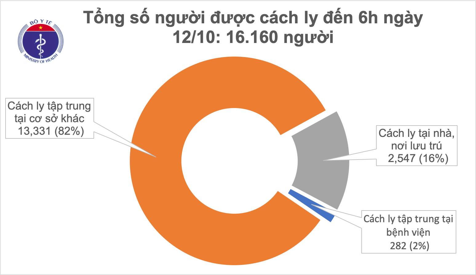 Bản tin sáng ngày 12/10, của Ban Chỉ đạo Quốc gia cho biết không có thêm ca mắc COVID-19 mới. Đến nay đã 40 ngày Việt Nam không ghi nhận ca mắc ở cộng đồng. Hiện 16.160 người đang cách ly chống dịch. Ngành y tế phối hợp với các Bộ, ngành tiếp tục quản lý, theo dõi, giám sát chặt chẽ người nhập cảnh; Xử lý nghiêm các trường hợp khai báo y tế không trung thực, không thực hiện cách ly theo quy định.