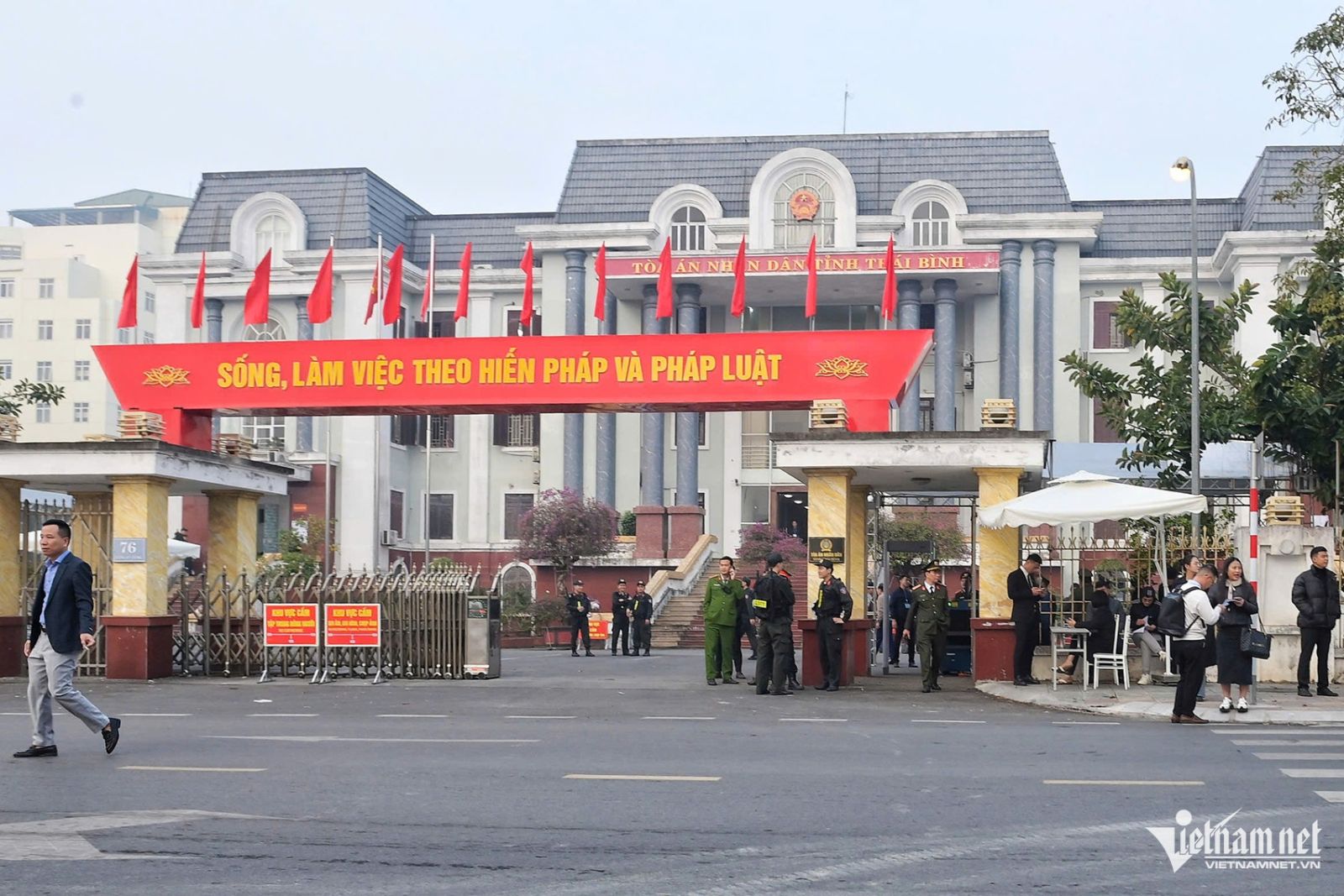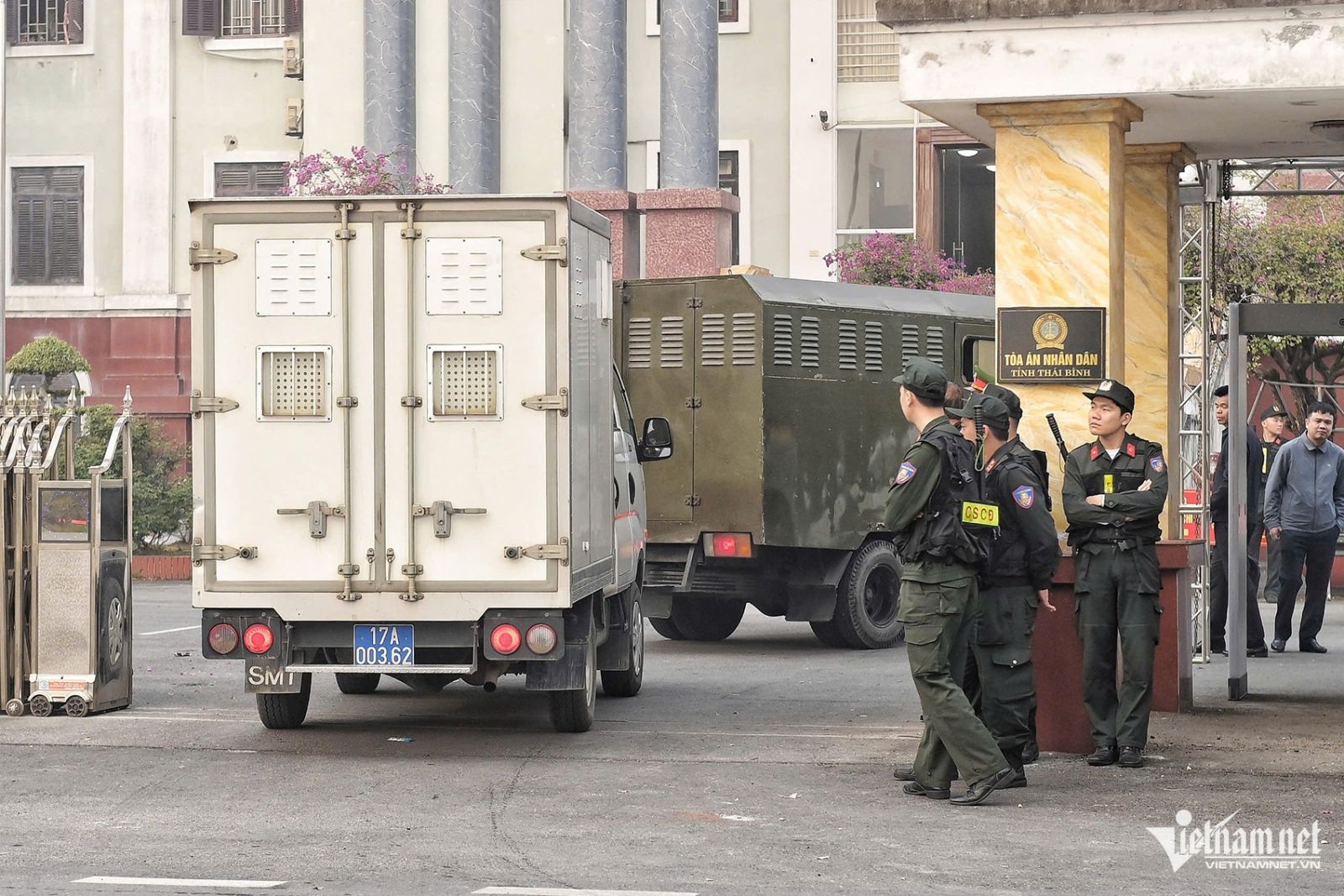 Theo Người Lao động, từ sáng sớm, lực lượng chức năng đã dựng rào chắn ở đầu những tuyến đường vào trụ sở TAND tỉnh Thái Bình. Quanh khu vực tòa và cổng tòa có thêm hai lớp an ninh, cửa từ kiểm soát. Đến 7h20, đoàn xe ô tô chở các bị cáo tới toà và nhanh chóng đi ra lối cửa sau, chỉ lực lượng an ninh được tiếp cận.
