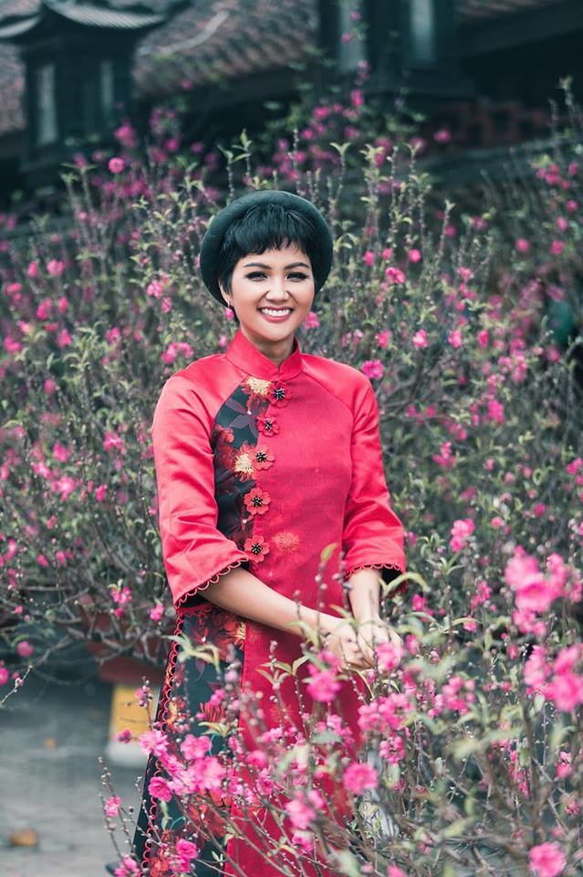 Sáng đầu năm, H'Hen Niê khoe ảnh xúng xính áo dài đỏ, rạng rỡ khoe sắc bên hoa đào tươi thắm. Nàng hậu gửi lời chúc năm mới đến toàn thể mọi người khiến ai nấy đều thích thú. (Ảnh: FBNV)