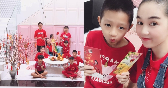 Ngọc Trinh cùng dàn cháu diện váy áo đỏ rực sáng mùng 1 Tết. Người đẹp chia sẻ vào ngày đầu năm mới, cô thường ở nhà đợi các cháu của mình sang chơi và mừng tuổi cho các bé. (Ảnh: FBNV)