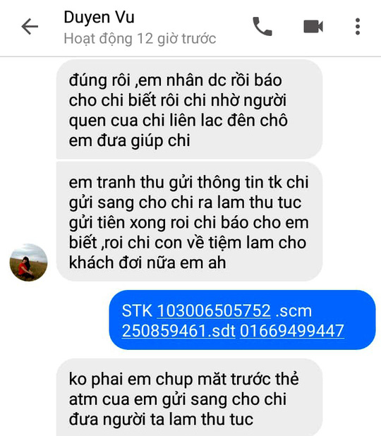 Lập tức điện thoại của chị Trang liên tiếp báo tài khoản ATM của chị bị trừ hai lần 10 triệu đồng, một lần 2 triệu đồng và một lần 500 nghìn đồng. Cũng từ đây, tài khoản facebook Duyen Vu không trả lời chị Trang nữa.