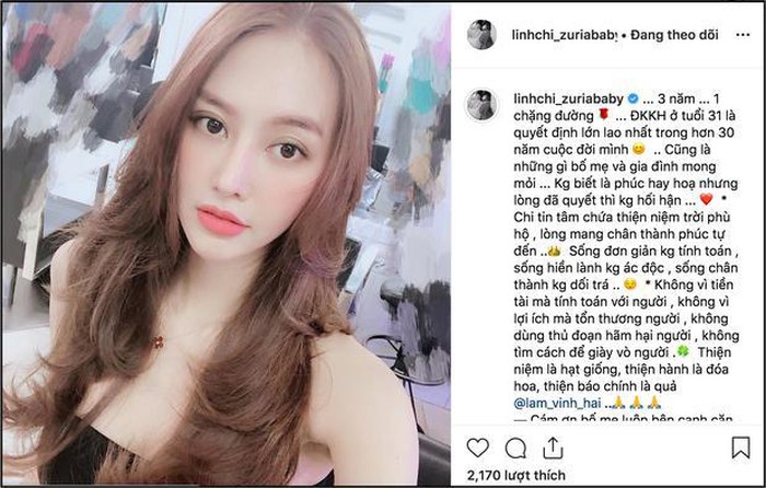 Thông qua Instagram của mình, Linh Chi chia sẻ: "3 năm 1 chặng đường, đăng ký kết hôn ở tuổi 31 là quyết định lớn lao nhất trong hơn 30 năm cuộc đời mình, cũng là những gì bố mẹ và gia đình mong mỏi. Không biết là phúc hay hoạ nhưng lòng đã quyết thì không hối hận. Chi tin tâm chứa thiện niệm trời phù hộ, lòng mang chân thành phúc tự đến. Sống đơn giản không tính toán, sống hiền lành không ác độc, sống chân thành không dối trá. Không vì tiền tài mà tính toán với người, không vì lợi ích mà tổn thương người, không dùng thủ đoạn hãm hại người, không tìm cách để giày vò người. Thiện niệm là hạt giống, thiện hành là đóa hoa, thiện báo chính là quả. Cám ơn bố mẹ luôn bên cạnh căn dặn con những điều này", Linh Chi viết.