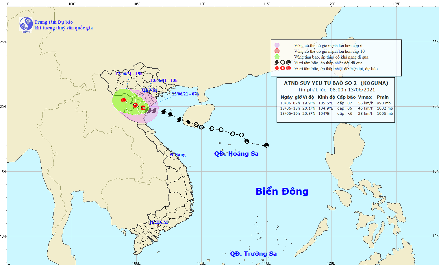 Dự báo trong 06 giờ tới, áp thấp nhiệt đới di chuyển theo hướng Tây Tây Bắc, mỗi giờ đi được 15-20km và suy yếu thêm. Đến 13 giờ ngày 13/6, vị trí tâm áp thấp nhiệt đới ở khoảng 20,1 độ Vĩ Bắc; 104,9 độ Kinh Đông, trên khu vực biên giới Việt-Lào. Sức gió mạnh nhất vùng gần tâm áp thấp nhiệt đới mạnh cấp 6 (40-50km/giờ), giật cấp 7.