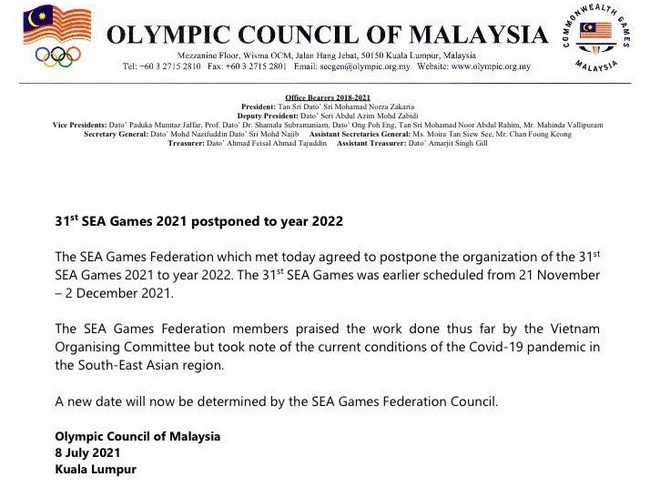 Trong cuộc họp trực tuyến của SEAGF vào chiều ngày 8/7, sau khi xem xét, đánh giá kỹ lưỡng diễn biến của dịch COVID-19 tại nhiều quốc gia trong khu vực Đông Nam Á, cùng với đó là đề xuất hoãn tổ chức SEA Games 31 của nước chủ nhà Việt Nam, Liên đoàn Thể thao Đông Nam Á (SEAGF) đã ra quyết định hoãn SEA Games 31 sang năm 2022. Không thể diễn ra trong năm 2021, SEA Games 31 được dự kiến hoãn lại tới tháng 4 hoặc tháng 5/2022.