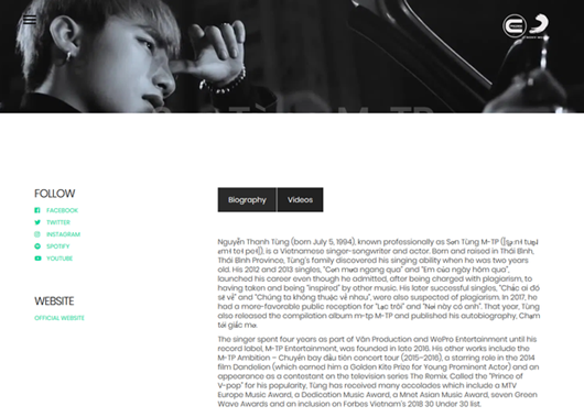 Bên cạnh đó, phần thông tin của Sơn Tùng M-TP cũng được trang chủ Concore Entertainment cập nhật đầy đủ. Trong đó có các mốc sự kiện quan trọng, tên nhiều bản hit cùng các giải thưởng lớn mà Sơn Tùng M-TP có được cho đến hiện tại. Ngoài ra là các kênh thông tin và các trang mạng xã hội của Sơn Tùng cũng được cập nhật đầy đủ để khán giả quốc tế tiện theo dõi.