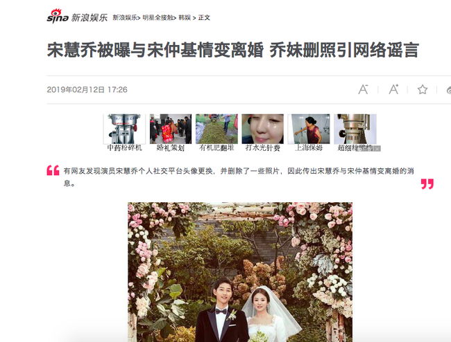 Vừa qua ngày 12/2, Sina Entertainment và loạt fanpage xứ Trung đưa tin, Song Hye Kyo xóa loạt ảnh Instagram và thậm chí còn thay hình đại diện. Động thái này của nữ minh tinh "Hậu duệ mặt trời" không khỏi khiến dân tình "đứng ngồi không yên" và không lâu sau đó, tin đồn cô cùng chồng Song Joong Ki ly dị rộ lên ầm ĩ trên mạng xã hội.