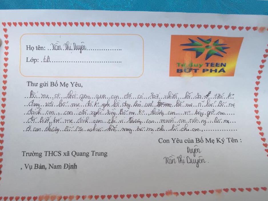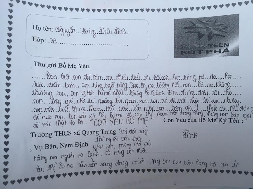 Tự đáy lòng mình, các em học sinh đã nói được và viết ra những dòng cảm xúc, biết ơn và tự hào về cha mẹ, thầy cô và những người xung quanh. Những giọt nước mắt vẫn còn chưa kịp khô trên những trên trang thư để nói rằng: “Gia đình là nơi cuộc sống bắt đầu và là tình yêu không bao giờ kết thúc”.