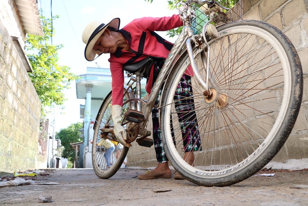 Hằng ngày, bà Nguyễn Thị Lòn đạp chiếc xe đạp cà tàng đi quanh khu vực thôn Vĩnh Hy để nhặt rác. Đây là công việc bà Lòn đã làm hơn 15 năm qua. (Ảnh: Duy Quan)