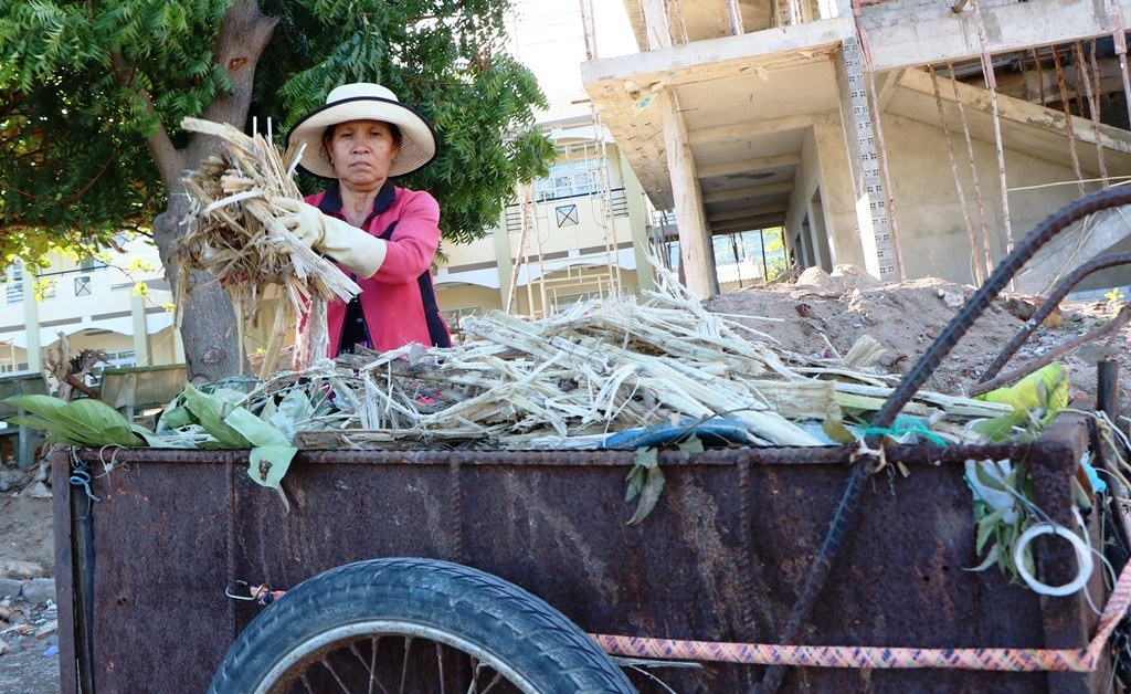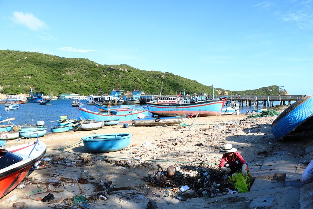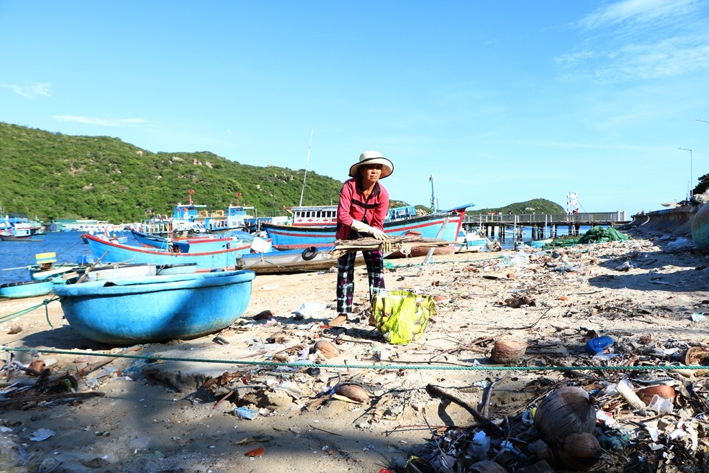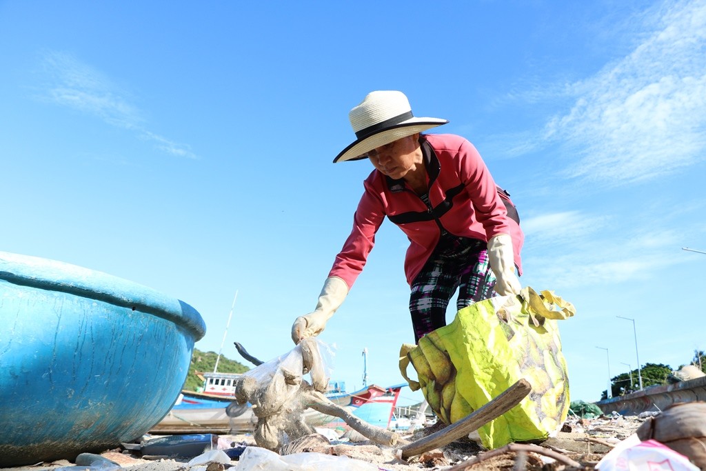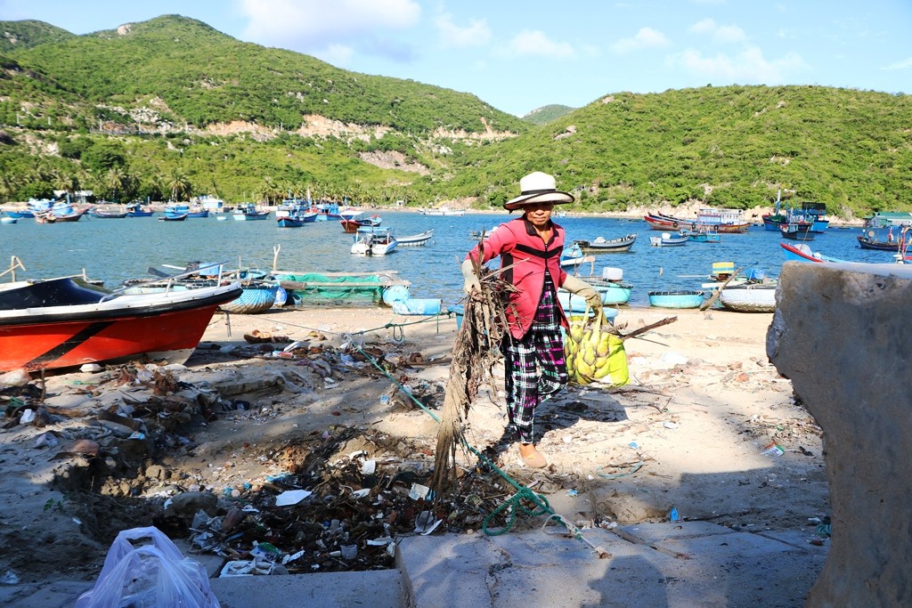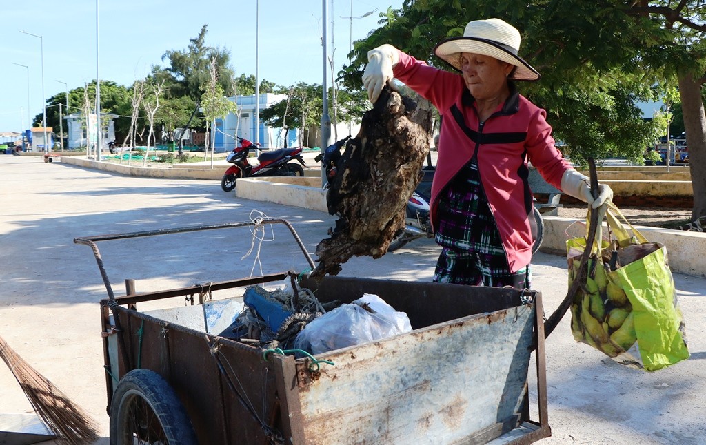 Bà Lòn cũng như bao phụ nữ khác của thôn Vĩnh Hy, bà cũng có một mái ấm gia đình, cuộc sống còn nhiều khó khăn, thiếu thốn đủ bề. Nhưng với tinh thần thiện nguyện đã thôi thúc bà Lòn vượt qua khó khăn của bản thân để giữ gìn môi trường biển ngày càng sạch đẹp hơn. (Ảnh: Duy Quan).