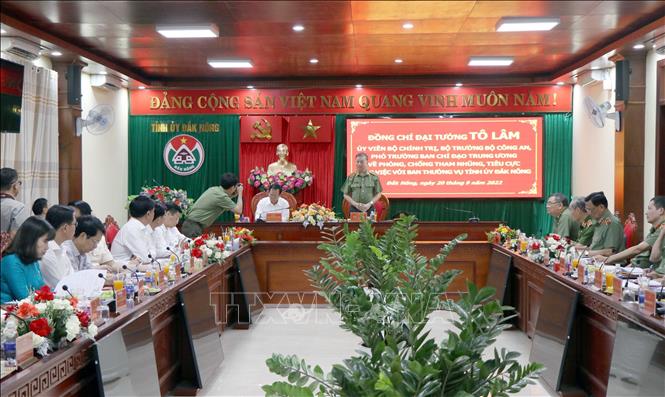 Tại buổi làm việc, Đại tướng Tô Lâm biểu dương các kết quả của tỉnh Đắk Nông trong phòng, chống, kéo giảm các loại tội phạm, đồng thời lưu ý tỉnh cần chú trọng hơn nữa trong xây dựng thế trận an ninh nhân dân; ngành công an tiếp tục đẩy mạnh công tác cải cách hành chính, tạo mọi thuận lợi cho người dân trong việc thực hiện các thủ tục hành chính. Đối với công tác phòng, chống tham nhũng, tiêu cực, tỉnh cần tập trung thực hiện nghiêm túc các chủ trương, chính sách của Đảng và Nhà nước về lĩnh vực này.