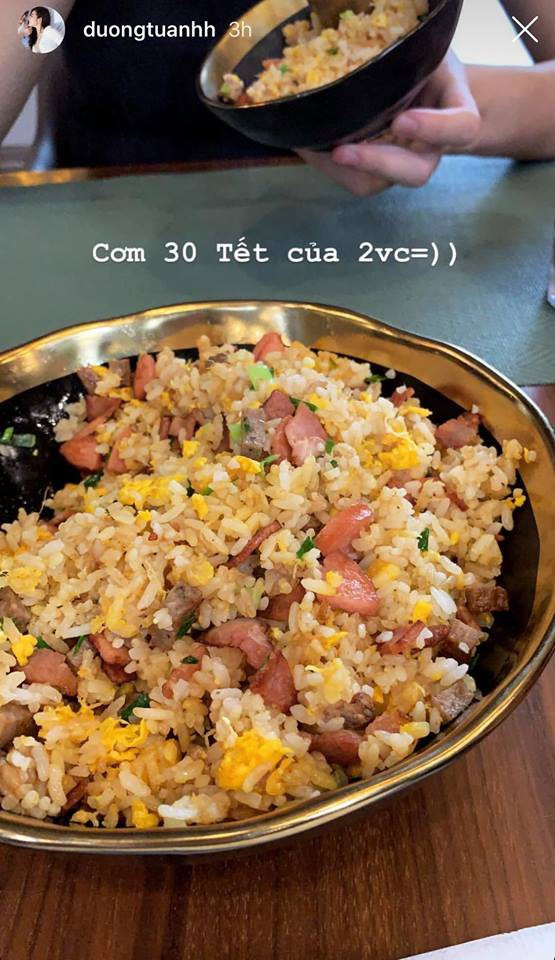 Trong khi đó, vợ chồng Á hậu Tú Anh có bữa ăn tất niên nhanh, gọn, lẹ với món cơm chiên trứng, chả, lạp xưởng. Đây là năm đầu tiên Tú Anh đón tết với vai trò nguời vợ, người mẹ. Nhiều ngày trước, cô liên tục chia sẻ hình ảnh trang trí nhà cửa bằng nhiều loại hoa khác nhau.