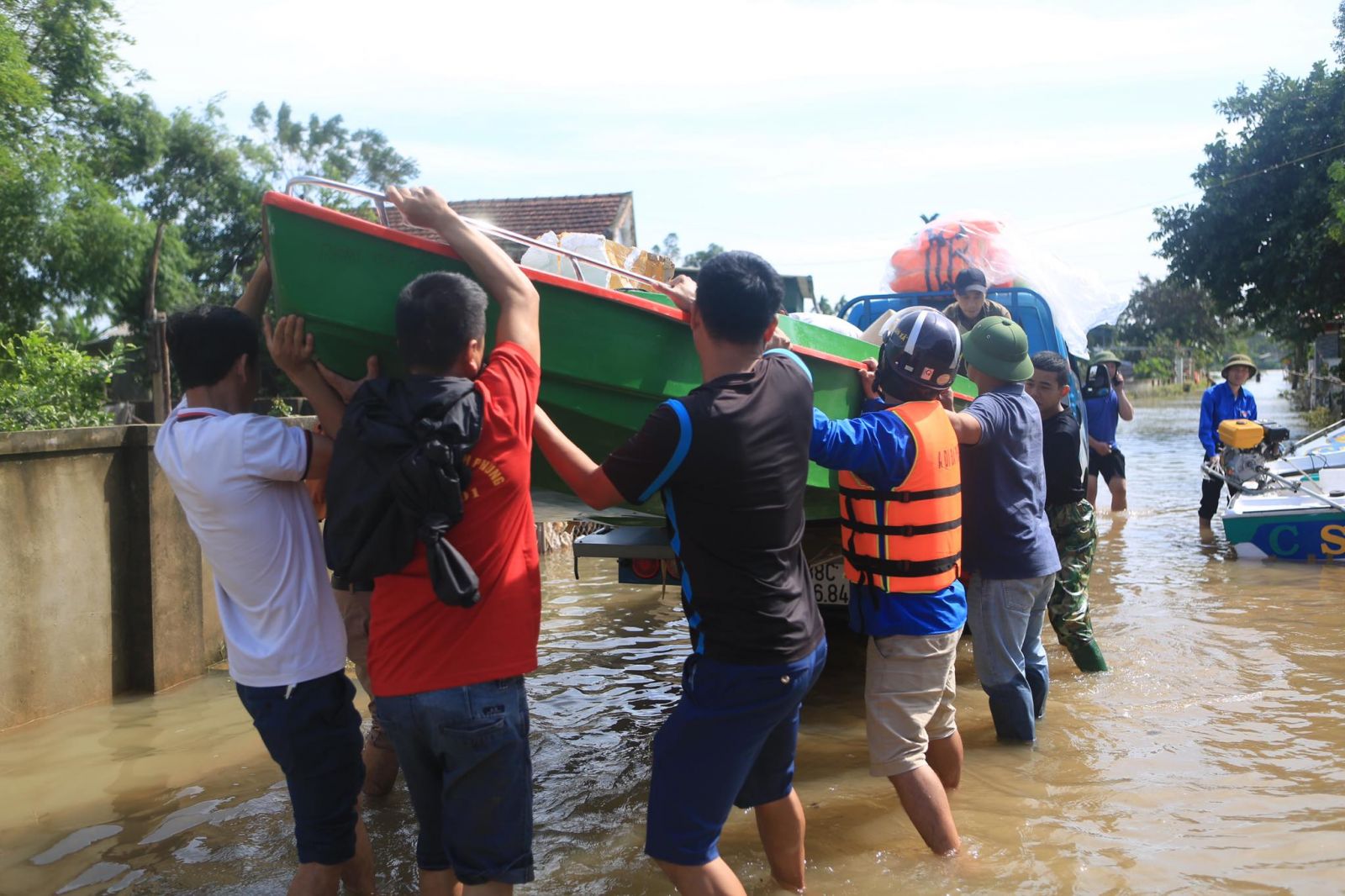 Theo ghi nhận, bước sang ngày thứ 5 của trận lũ, mực nước đã rút. Tuy nhiên, tại một số vùng của huyện Thạch Hà, huyện Cẩm Xuyên vẫn đang ngập sâu, bà con đang bị cô lập hoàn toàn. Đoàn cứu trợ Tạp chí Đời sống & Pháp luật, các mạnh thường quân đã di chuyển bằng thuyền máy, đến những điểm ngập sâu nhất, khó tiếp cận nhất để tiếp tế lương thực cho người dân.