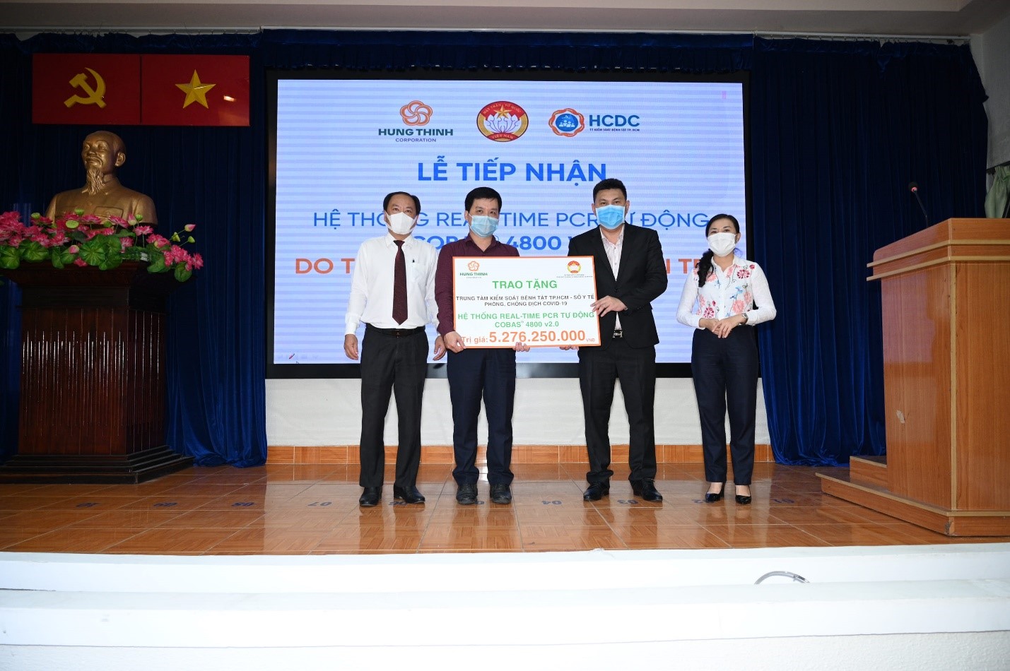 Tập đoàn Hưng Thịnh cũng là một trong những đơn vị luôn đi đầu trong việc đồng hành cùng Đất nước khống chế và đẩy lùi Covid-19 với tổng kinh phí ủng hộ gần 50 tỷ đồng trong năm 2020. Khởi đầu năm mới 2021, tiếp tục những hoạt động thiết thực, mới đây ngày 17/2/2021, Hưng Thịnh đã trao tặng hệ thống máy xét nghiệm Covid-19 tự động đầu tiên tại TP.HCM trị giá gần 5,3 tỷ đồng cho Trung tâm kiểm soát bệnh tật TP.HCM (HCDC), giúp rút ngắn 30% - 40% thời gian cho ra kết quả so với các phương pháp hiện có.