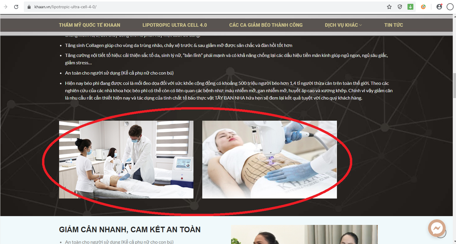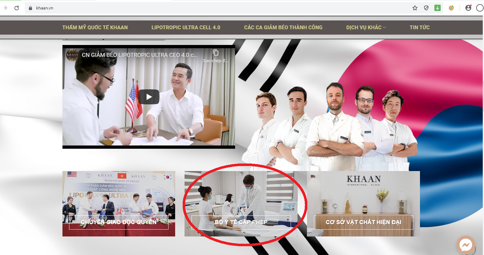 Tuy nhiên, tại website https://khaan.vn liên tục quảng cáo dịch vụ giảm béo có xâm lấn Lipotropic Ultra Cell 4.0 và các dịch vụ làm đẹp khác như: căng bóng trẻ hóa da, nâng cơ Hifu,…Điều đáng nói là cơ sở này còn quảng cáo là đã được Bộ Y tế cấp phép.