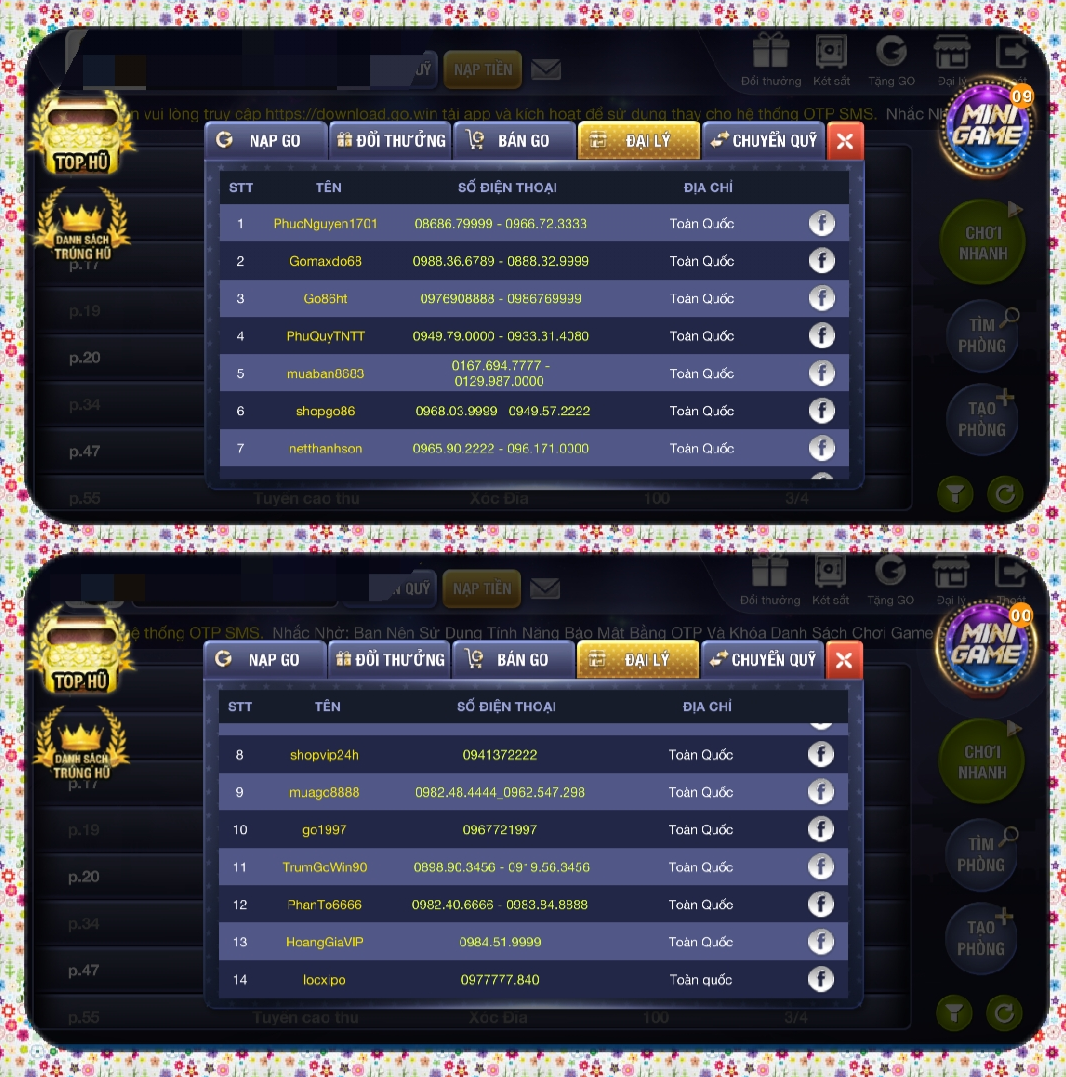 Theo tìm hiểu của PV được biết, khi nạp 1.000.000 đồng vào game thì đổi được 1.160.000 Go. Còn muốn đổi từ Go sang thẻ điện thoại, tiền mặt thì người chơi phải chuyển Go cho các đại lý rồi sau đó đại lý sẽ chuyển tiền mặt, nạp tiền vào điện thoại hoặc gửi thẻ cào cho người chơi. Trong cổng game này, đổi từ Go sang thẻ điện thoại cao nhất là thẻ cào có mệnh giá 200.000 đồng, còn người chơi muốn đổi mệnh giá cao hơn thì phải liên hệ với đại lý.