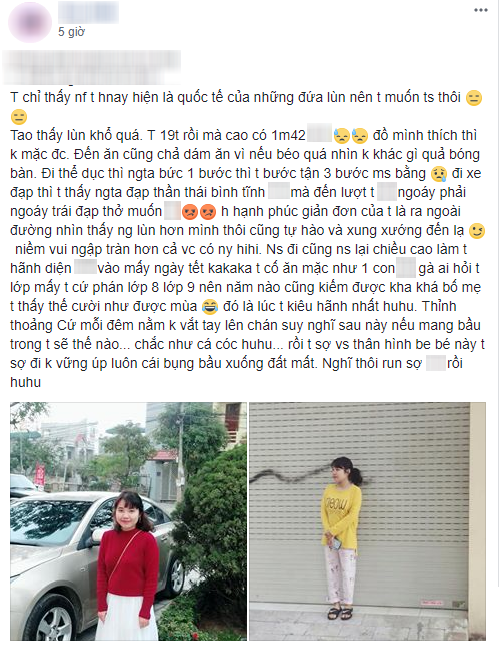 Cụ thể, mới đây, trên một diễn đàn, tài khoản T.H tâm sự: “Tớ thấy lùn khổ quá. Tớ 19 tuổi rồi mà cao có 1m42.