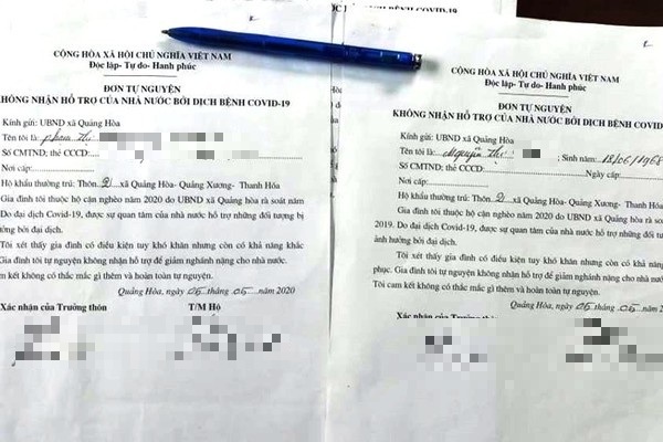 Được biết, trong lúc cả nước đang chung tay ủng hộ phòng, chống dịch Covid-19, việc người dân tự nguyện ký vào đơn không nhận tiền hỗ trợ và trả lại cho Chính phủ là việc làm rất ý nghĩa. Tuy nhiên, 2 ngày qua, tại Thanh Hóa xuất hiện thông tin với nội dung “ép dân ký đơn không nhận tiền hỗ trợ do dịch Covid-19, đơn đã được làm sẵn…”.