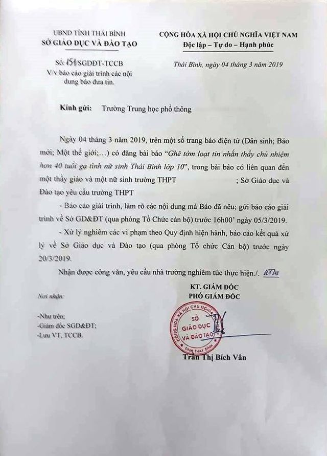 Ngày 4/3, Sở GD&ĐT tỉnh Thái Bình đã có công văn số 151/SGDĐT-TCCB gửi đến trường THPT được cho là nơi thầy giáo đang công tác, yêu cầu: