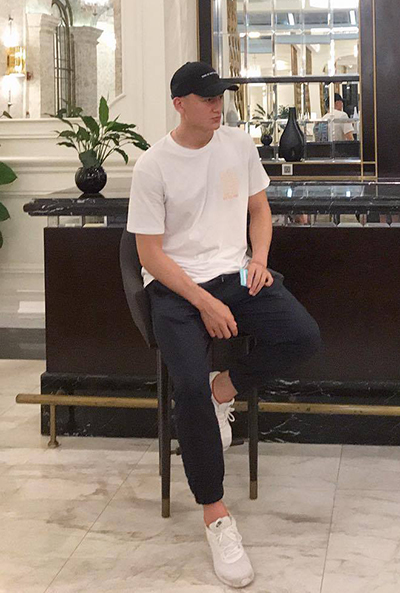 Ngoài sân cỏ, thủ thành 25 tuổi trung thành với phong cách sporty-chic. Anh chuộng mũ lưỡi trai, giày thể thao, áo phông... Đen, trắng là hai màu được chọn nhiều nhất.