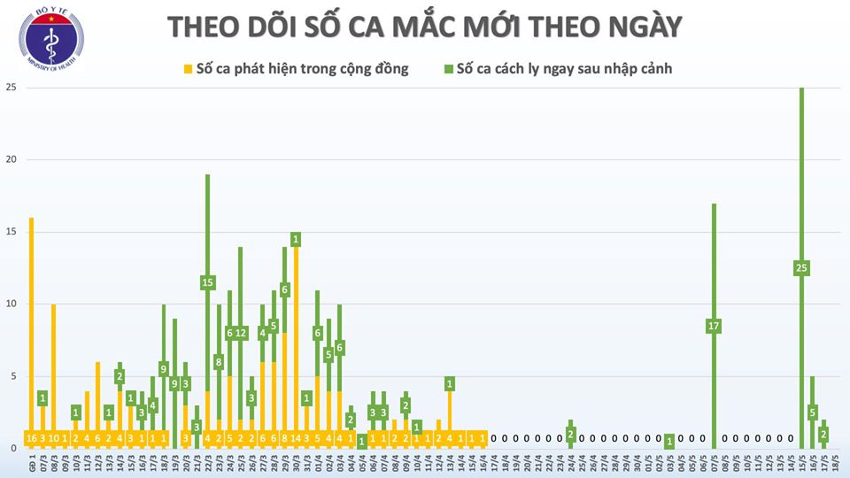 Tính đến sáng 18/5, Việt Nam ghi nhận 320 ca mắc COVID-19, đã 32 ngày không có ca lây nhiễm trong cộng đồng. Hiện có tổng cộng 180 ca nhiễm nhập cảnh được cách ly ngay.