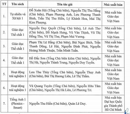 Cụ thể, 7 sách giáo khoa được phê duyệt ngày 21/2 gồm: 1 cuốn môn Tự nhiên xã hội (1 cuốn), 3 cuốn môn Giáo dục thể chất, 2 cuốn môn Hoạt động trải nghiệm, 1 cuốn môn Tiếng Anh.