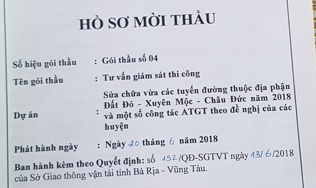 Trong đó có 2 gói Tư vấn giám sát thi công (gói 04) và Xây lắp (gói 06) thuộc Dự án: Sửa chữa vừa các tuyến đường thuộc địa phận Đất Đỏ - Xuyên Mộc - Châu Đức năm 2018 và một số công tác an toàn giao thông theo đề nghị của các huyện. Hai gói thầu có tổng giá trị gần 33 tỉ đồng, sử dụng vốn sự nghiệp kinh tế giao. Ngay sau thời điểm mở bán hồ sơ mời thầu (từ ngày 20/06/2018 đến ngày 10/07/2018), nhiều doanh nghiệp đã phản ánh đến cơ quan báo chí về việc các doanh nghiệp sẽ “đi đêm” với nhau để trúng các gói thầu này.