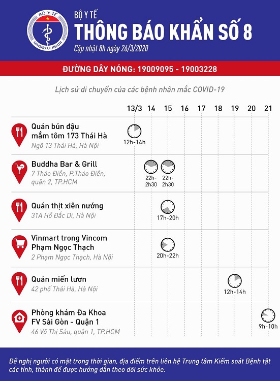 Bộ Y tế đề nghị, tất những ai có mặt trong thời gian và địa điểm này cần liên hệ ngay với Trung tâm Kiểm soát Bệnh tật các tỉnh, thành phố để được hướng dẫn theo dõi sức khoẻ.