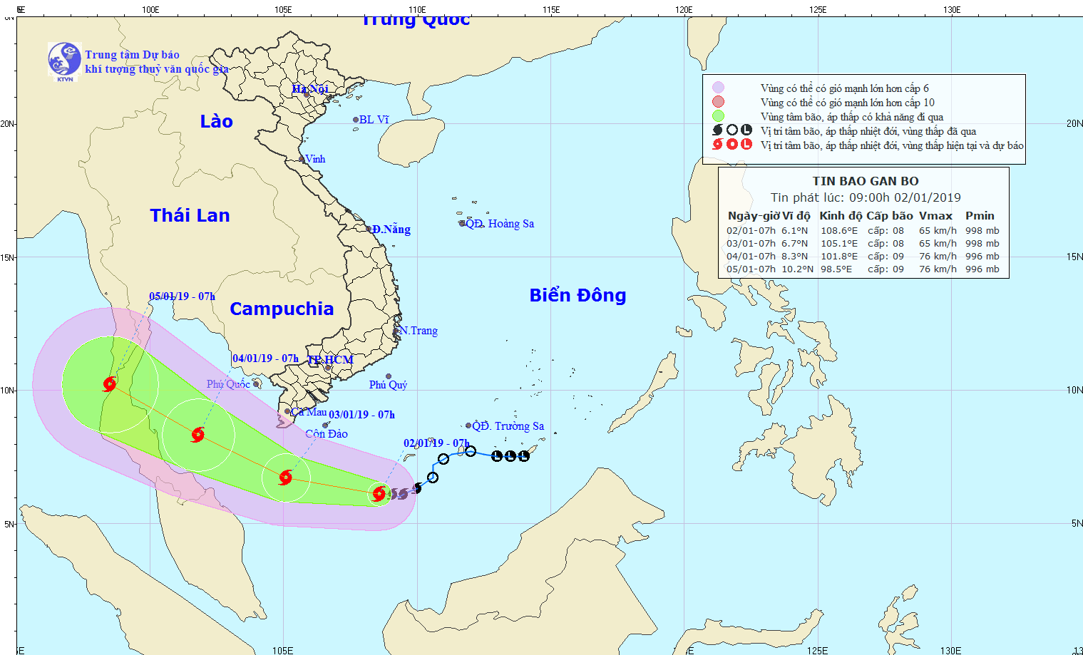 Theo Trung tâm Dự báo khi tượng Thủy văn quốc gia, vào hồi 7h ngày 2/1, vị trí tâm bão ở vào khoảng 6,1 độ Vĩ Bắc; 108,6 độ Kinh Đông, cách đất liền các tỉnh Nam Bộ khoảng 460km về phía Đông Nam, cách Côn Đảo khoảng 360km về phía Đông Nam. Sức gió mạnh nhất vùng gần tâm bão mạnh cấp 8 (60-75km/giờ), giật cấp 10.