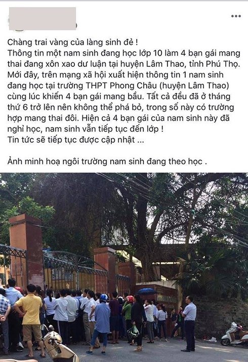 Trước đó, vào sáng ngày 6/5, mạng xã hội và một số phương tiện truyền thông đưa tin về việc 1 nam sinh đang học tại Trường THPT Phong Châu (huyện Lâm Thao, Phú Thọ) cùng lúc khiến 4 bạn nữ mang bầu. Điều đáng nói, tất cả đều đã mang thai ở tháng thứ 6 trở lên nên không thể phá bỏ. Sau sự việc, cả 4 bạn gái của nam sinh này đã nghỉ học, riêng nam sinh vẫn tiếp tục đến lớp.