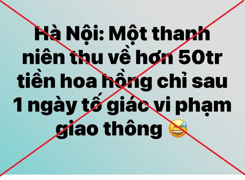 Theo Công an TP.Hà Nội, ngày 3/1, một số trang mạng xã hội đưa thông tin “Hà Nội: Một thanh niên thu về 50 triệu đồng chỉ sau 1 ngày tố giác vi phạm giao thông”. Công an thành phố Hà Nội khẳng định đây là thông tin sai sự thật.