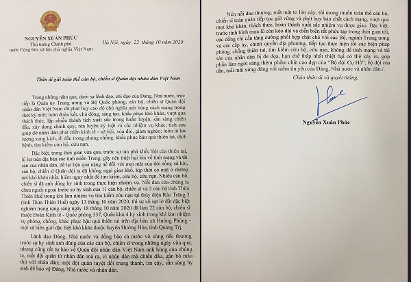 Đặc biệt, trong thời gian vừa qua, trước sự tàn phá khốc liệt của thiên tai, lũ lụt trên địa bàn các tỉnh miền Trung, gây nên thiệt hại lớn về tính mạng và tài sản của nhân dân, để lại hậu quả nặng nề đối với mọi mặt của đời sống xã hội, cán bộ, chiến sĩ Quân đội ta đã không ngại gian khổ, kịp thời có mặt ở những nơi khó khăn nhất, hiểm nguy nhất để tìm kiếm, cứu hộ, cứu nạn. Nhiều cán bộ, chiến sĩ đã anh dũng hy sinh trong thực hiện nhiệm vụ. Nỗi đau của chúng ta chưa nguôi ngoai trước sự hy sinh của 11 cán bộ, chiến sĩ và 2 cán bộ tỉnh Thừa Thiên Huế trong khi làm nhiệm vụ tìm kiếm cứu nạn tại thủy điện Rào Trăng 3 (tỉnh Thừa Thiên Huế) ngày 13 tháng 10 năm 2020, thì sự cố sạt lở đất đặc biệt nghiêm trọng rạng sáng ngày 18 tháng 10 năm 2020 đã làm 22 cán bộ, chiến sĩ thuộc Đoàn Kinh tế - Quốc phòng 337, Quân khu 4 hy sinh trong khi làm nhiệm vụ phòng, chống, khắc phục hậu quả thiên tai trên địa bàn xã Hướng Phùng - một xã biên giới đặc biệt khó khăn thuộc huyện Hướng Hóa, tỉnh Quảng Trị.