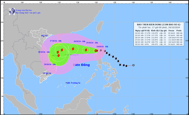 Theo dự báo của Trung tâm dự báo khí tượng thủy văn quốc gia, trong 24 đến 48 giờ tới bão sẽ tiếp tục mạnh thêm, sức gió mạnh nhất vùng gần tâm bão có thể đạt cấp 11-12, giật cấp 14-15, di chuyển theo hướng tây về phía quần đảo Hoàng Sa, sau đó có thể ảnh hưởng đến vùng biển ngoài khơi và ven bờ các tỉnh khu vực Trung Bộ (từ Hà Tĩnh đến Bình Định) trong khoảng từ ngày 27 - 29 tháng 10 năm 2024.