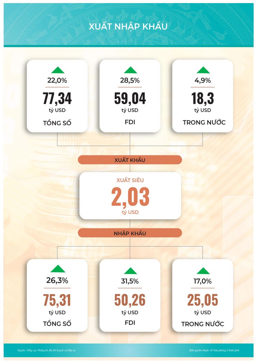 Hoạt động xuất nhập khẩu ghi nhận sự phục hồi mạnh mẽ, tận dụng hiệu quả các Hiệp định FTA đã được ký kết. Tổng kim ngạch xuất nhập khẩu ước đạt 152,7 tỷ USD, tăng 24,1% (cùng kỳ tăng 5,9%). Xuất siêu trên 2 tỷ USD.