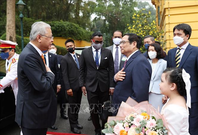 Khi đoàn xe đưa Thủ tướng Malaysia Dato’ Sri Ismail Sabri bin Yaakob và Đoàn đại biểu cấp cao Chính phủ liên bang Malaysia tới Phủ Chủ tịch, Thủ tướng Chính phủ Phạm Minh Chính đã ra tận cửa xe đón Thủ tướng Malaysia Dato’ Sri Ismail Sabri bin Yaakob. Hai Thủ tướng vui mừng bắt tay nồng ấm. Các cháu thiếu nhi Thủ đô đã tặng hoa, vẫy chào Thủ tướng Malaysia Dato’ Sri Ismail Sabri bin Yaakob và Đoàn đại biểu cấp cao Chính phủ liên bang Malaysia.