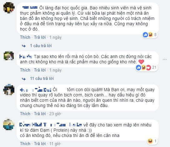 "Cứ mấy hôm lại nghe ăn chỗ này có dòi, chỗ kia có ruồi, rồi thức ăn ôi thiu. Nhà ăn ký túc xá cũng sợ mà hàng quán bên ngoài cũng hãi. Sinh viên sống ở ký túc xá không biết phải ăn ở đâu", bạn Hoàng Mai cho biết.