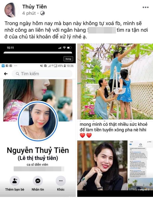 Theo đó, nữ ca sĩ nhấn mạnh sẽ nhờ công an can thiệp nếu tài khoản giả mạo trên tiếp tục tồn tại: “Trong hôm nay mà bạn này không tự xóa tài khoản, tôi sẽ nhờ công an liên hệ với ngân hàng tìm ra tận nơi ở của chủ tài khoản để xử lý nhé ạ”, cô viết.