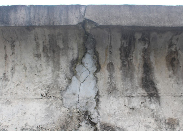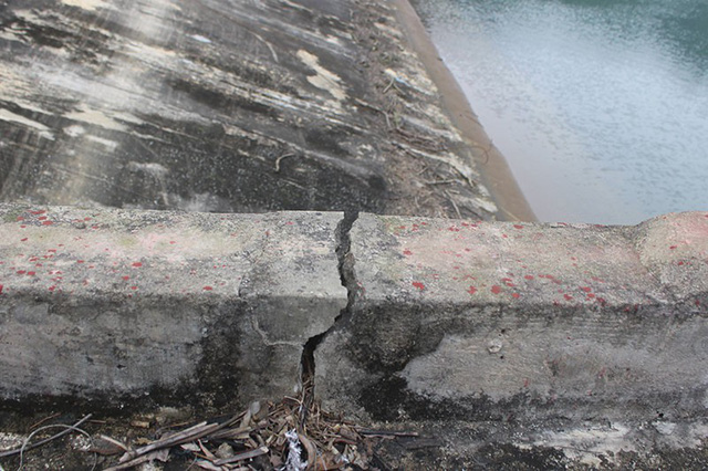 Tại công trình không khó để nhận thấy những vết nứt kéo dài hàng chục mét ở những mảng bê tong kè mái phía trước thân đập. Ở phía cử tràn, những vết nứt đã được đơn vị thi công vá víu lại nhưng đường nứt vẫn hoác ra. Toàn bộ khu vực tràn đều xuất hiện những vết nứt gãy bê tông lớn nhỏ.