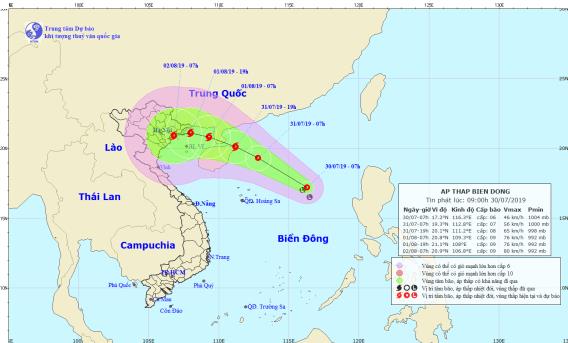 Dự báo trong 24 giờ tới, áp thấp nhiệt đới di chuyển theo hướng Tây Tây Bắc, mỗi giờ đi được 15-20km và có khả năng mạnh thêm. Đến 07 giờ ngày 31/7, vị trí tâm áp thấp nhiệt đới ở khoảng 19,3 độ Vĩ Bắc; 112,8 độ Kinh Đông, cách đảo Hải Nam 200km về phía Đông. Sức gió mạnh nhất vùng gần tâm áp thấp nhiệt đới mạnh cấp 7 (50-60km/giờ), giật cấp 9.