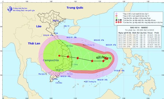 Dự báo trong 24 giờ tới, bão di chuyển chậm về phía Đông, mỗi giờ đi được khoảng 5km và có khả năng mạnh thêm. Đến 07 giờ ngày 07/11, vị trí tâm bão ở khoảng 13,4 độ Vĩ Bắc; 116,6 độ Kinh Đông, cách đảo Song Tử Tây khoảng 330km về phía Đông Bắc. Sức gió mạnh nhất vùng gần tâm bão mạnh cấp 9-10 (75-100km/giờ), giật cấp 12.