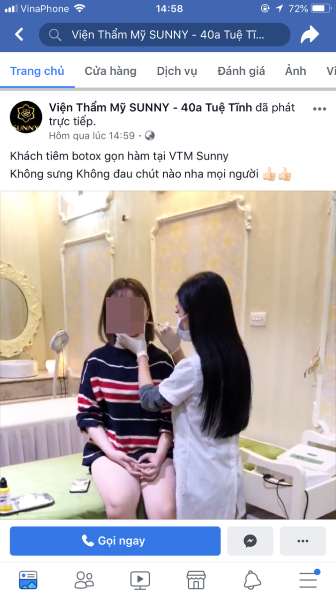 Trước đó, PV đã vào vai một khách hàng có nhu cầu cần tư vấn về các liệu trình tiêm filler, botox. Ngày 21/11/2018, PV đã liên hệ qua đường dây nóng của cơ sở và được nhân viên tại đây chia sẻ: “Nếu muốn làm gọn mặt thì khách hàng sẽ phải tiêm botox. Nếu tiêm gọn hàm thì bên cơ sở sẽ có giá là 7,5 triệu một lần tiêm. Còn tiêm filler thì sẽ có 4 loại với mức giá giao động từ 4 triệu, 6 triệu, 8 triệu và 9,5 triệu. Con trai cũng đến đây tiêm rất nhiều, tiêm botox thon gọn mặt thì 7,5 triệu là trọn gói cả 2 bên má, sau khi tiêm thì khuôn mặt sẽ nhỏ lại luôn. Trong khoảng thời gian 1 tuần sẽ nhỏ lại khá nhiều và rất hiệu quả. Khách hàng nếu quan tâm thì cứ qua trực tiếp cơ sở sẽ có bác sĩ tư vấn về các liệu trình phù hợp, tiêm botox chỉ làm 1 lần là đẹp. Làm tại cơ sở ở Tuệ Tĩnh hoặc cơ sở ở Sài Gòn đều có bác sĩ làm cho khách hàng.”
