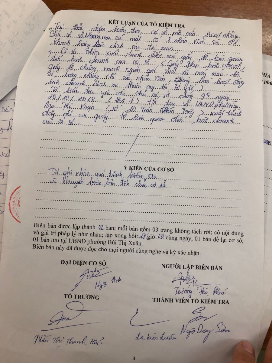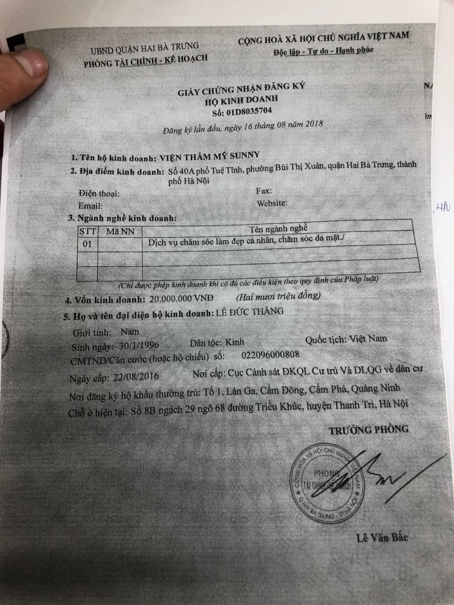Nhằm làm rõ tính chất pháp lý của viện thẩm mỹ Sunny, PV đã có buổi làm việc chính thức với lãnh đạo UBND phường Bùi Thị Xuân. Theo bà Trần Thanh Hải, phó chủ tịch phường, cơ sở thẩm mỹ 40A Tuệ Tĩnh này trước vẫn để biển tên là Sunny nhưng của chủ cơ sở khác, chủ cơ sở này có 1 cái ở Sài Gòn và 1 cái ở 40A Tuệ Tĩnh. Trong quá trình hoạt động thì cơ sở ngoài Hà Nội hoạt động không hiệu quả, không có khách nên đến tháng 8/2018 nhượng lại cho một người chủ mới đến kinh doanh, giấy phép mới từ ngày 16/8/2018.