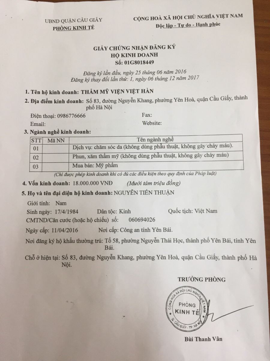 Liên quan đến vụ việc này, trong buổi làm việc với UBND phường Yên Hòa, bà Trần Hải Yến, Phó Chủ tịch phường cho biết, phạm vi hoạt động của cơ sở thẩm mỹ Việt Hàn có địa chỉ tại 83 Nguyễn Khang, theo đăng ký kinh doanh, cơ sở được cấp ngày 6/12/2017 đăng ký lại lần thứ nhất thì cơ sở chỉ được thực hiện các dịch vụ chăm sóc da phun xăm thẩm mỹ, không được phép làm phẫu thuật, không gây chảy máu.
