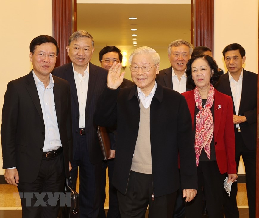 Tổng Bí thư, Chủ tịch nước nói: "Phải bắt tay ngay vào công việc, không được say sưa với Tết, nhất là triển khai thật tốt thực hiện các chủ trương Đại hội XIII đã đề ra, từ việc tổ chức học tập, xây dựng chương trình hành động, tất cả các ngành, các cấp, địa phương, cơ quan đều phải làm… Như tôi đã nói, Đại hội thành công chỉ là một bước ra định hướng lớn thôi, giờ phải cụ thể hóa, thể chế hóa, tất cả các cấp phải làm để không chỉ trên giấy. Tất cả công việc đang làm phải làm tiếp, thiếu sót gì phải chấn chỉnh ngay, ưu điểm phát huy theo tinh thần Đại hội XIII mới thông qua".